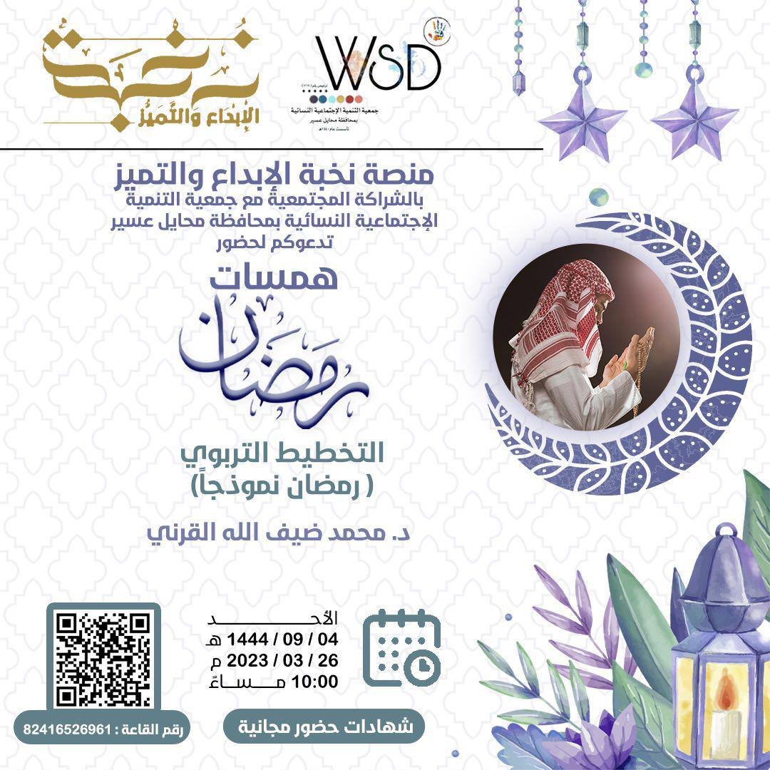 منصة نخبة الإبداع والتميز بالشراكة المجتمعية مع جمعية التنمية الاجتماعية النسائية بمحافظة محايل عسير تدعوكم لحضور همسات رمضان بعنوان: (( التخطيط التربوي )) الأحد ٤ رمضان - ٢٦ مارس تبدأ الساعة ١٠ مساءً الشهادة (( شهادة حضور )) رابط الـ ZOOM : https://t.co/z9Rpz2mgU2 https://t.co/pc3WGINyIX