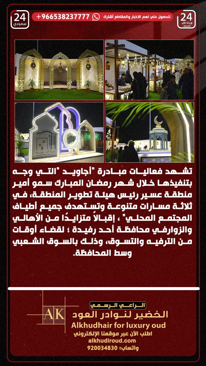 تشهد فعاليات مبادرة "أجاويد "التي وجه بتنفيذها خلال شهر رمضان المبارك سمو أمير منطقة عسير رئيس هيئة تطوير المنطقة، في ثلاثة مسارات متنوعة وتستهدف جميع أطياف المجتمع المحلي" ، إقبالاً متزايدًا من الأهالي والزوارفي محافظة أحد رفيدة ؛ لقضاء أوقات من الترفيه والتسوق، وذلك بالسوق… https://t.co/dP0PDEsuv